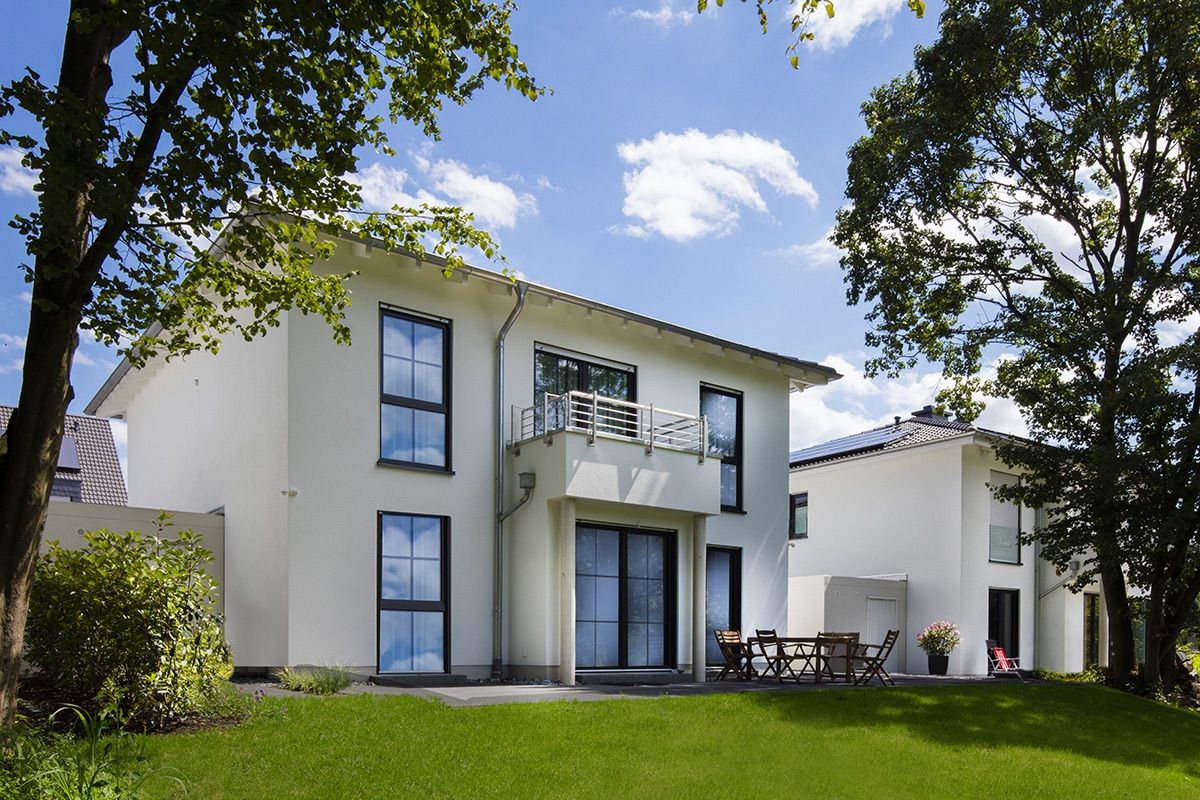 - Massive Bauweise: Außenwände 36,5 cm starke Plansteine aus Porenbeton in der Festigkeits-/Rohdichteklasse PP2-0,35 mit einer Wärmeleitfähigkeit von 0,09 W/(m·K) und mineralischem Putz