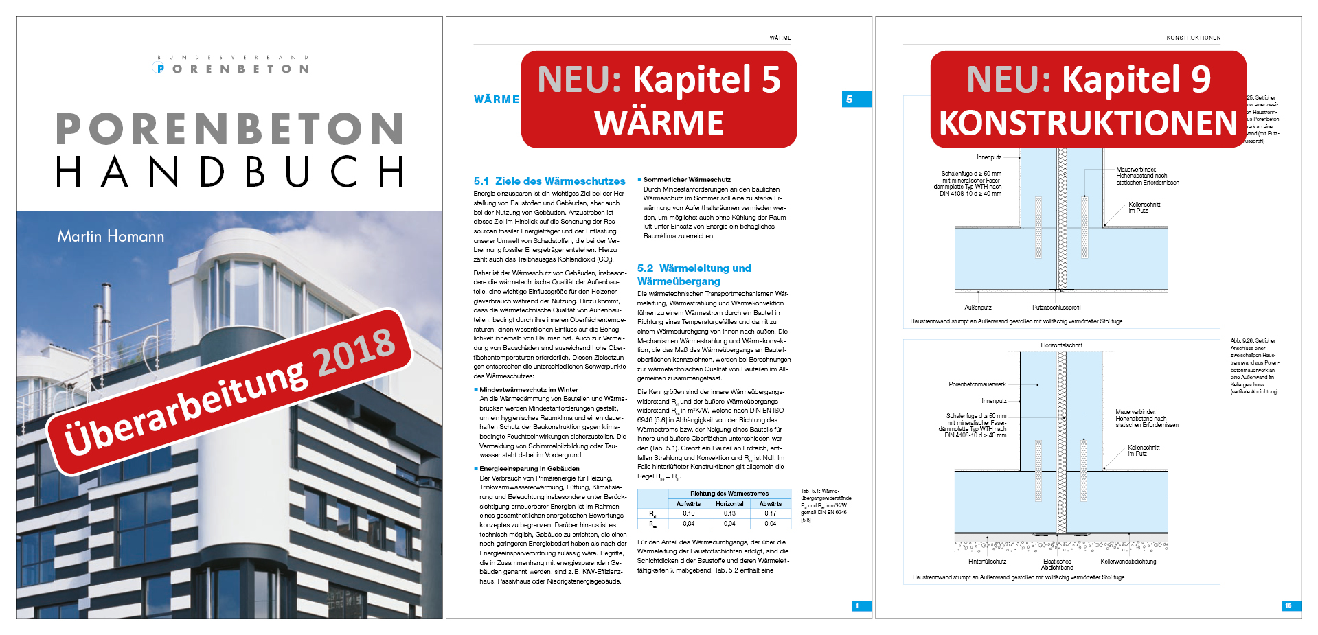 Das Porenbeton-Handbuch wird derzeit überarbeitet und nach Fertigstellung in seiner 7. Auflage neu herausgegeben. Neben den bereits 2017 überarbeiteten Kapiteln 4 „Berechnung“, 6 „Feuchte“, 7 „Schall“ und 8 „Brand“ wurden die zwei Kapitel 5 „Wärme“ und 9 „Konstruktionen“ in 2018 final überarbeitet und auf unserer Website zum Download eingestellt: Porenbeton-Handbuch 7. Auflage (Überarbeitungen 2017 / 2018).