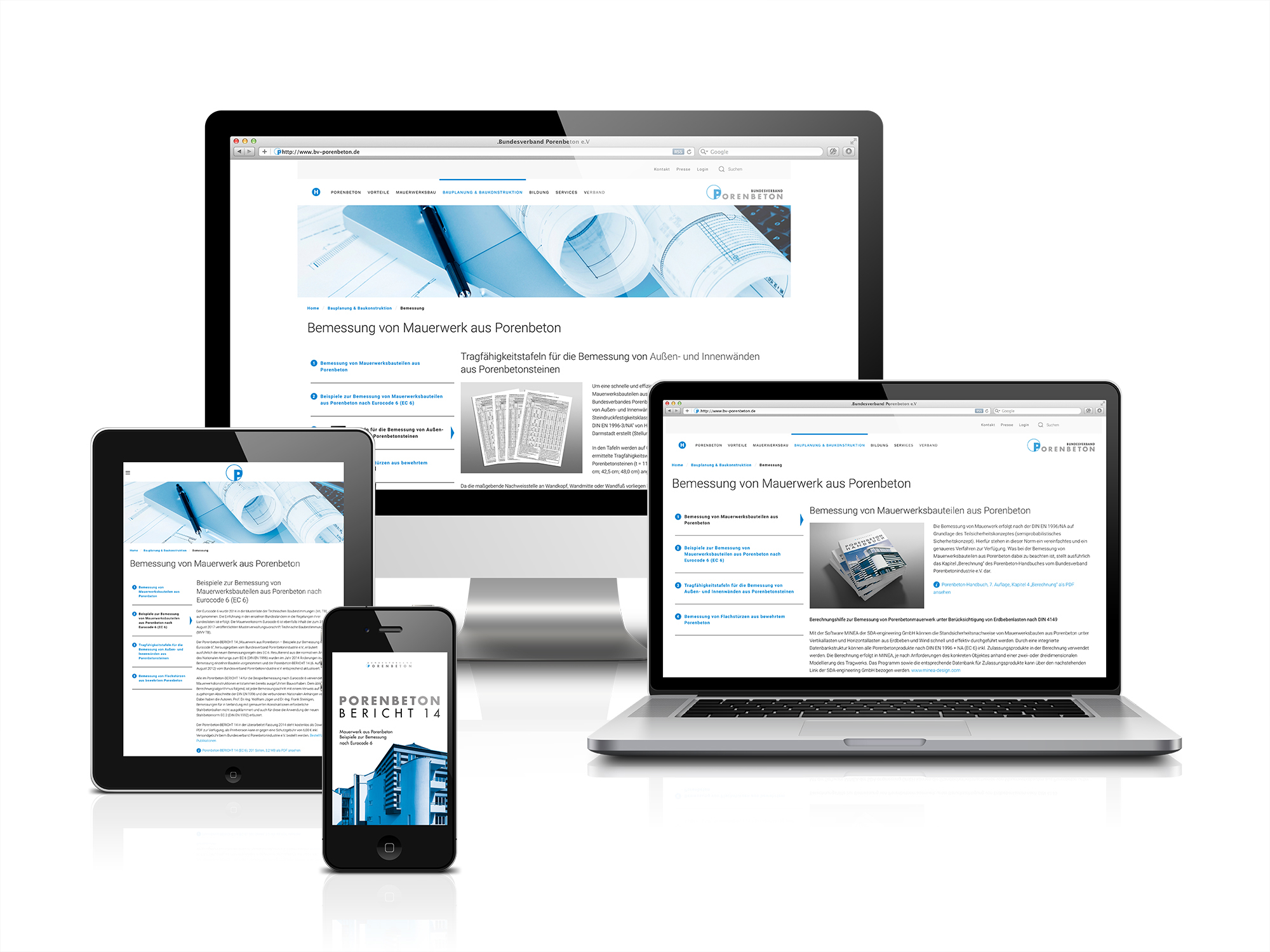 Die neue Website des Bundesverbandes Porenbetonindustrie e.V. wurde übersichtlicher strukturiert, inhaltlich und funktional überarbeitet, im moderneren Design gestaltet und responsiv programmiert, d. h. sie passt sich in Bildschirmdarstellung und -auflösung automatisch den unterschiedlichen Endgeräten wie Smartphone und Tablet an. Anschaulich wird alles Wissenswerte rund um den Baustoff Porenbeton wie seine Herstellung und Eigenschaften, die verschiedenen Porenbetonsteine und Wandkonstruktionen sowie seine Vorteile im massiven Mauerwerksbau dargestellt. Die Seite bietet auch den direkten Zugang zu umfassenden Informationen und Berechnungstools, die beispielsweise Architekten und Ingenieure benötigen, um Standsicherheitsnachweise von Mauerwerksbauten aus Porenbeton zu erstellen sowie grundsätzliche Informationen zu den Bemessungsgrundlagen als auch Bemessungstabellen, Tragfähigkeitstafeln und Musterberechnungen zur Ansicht und zum Download.